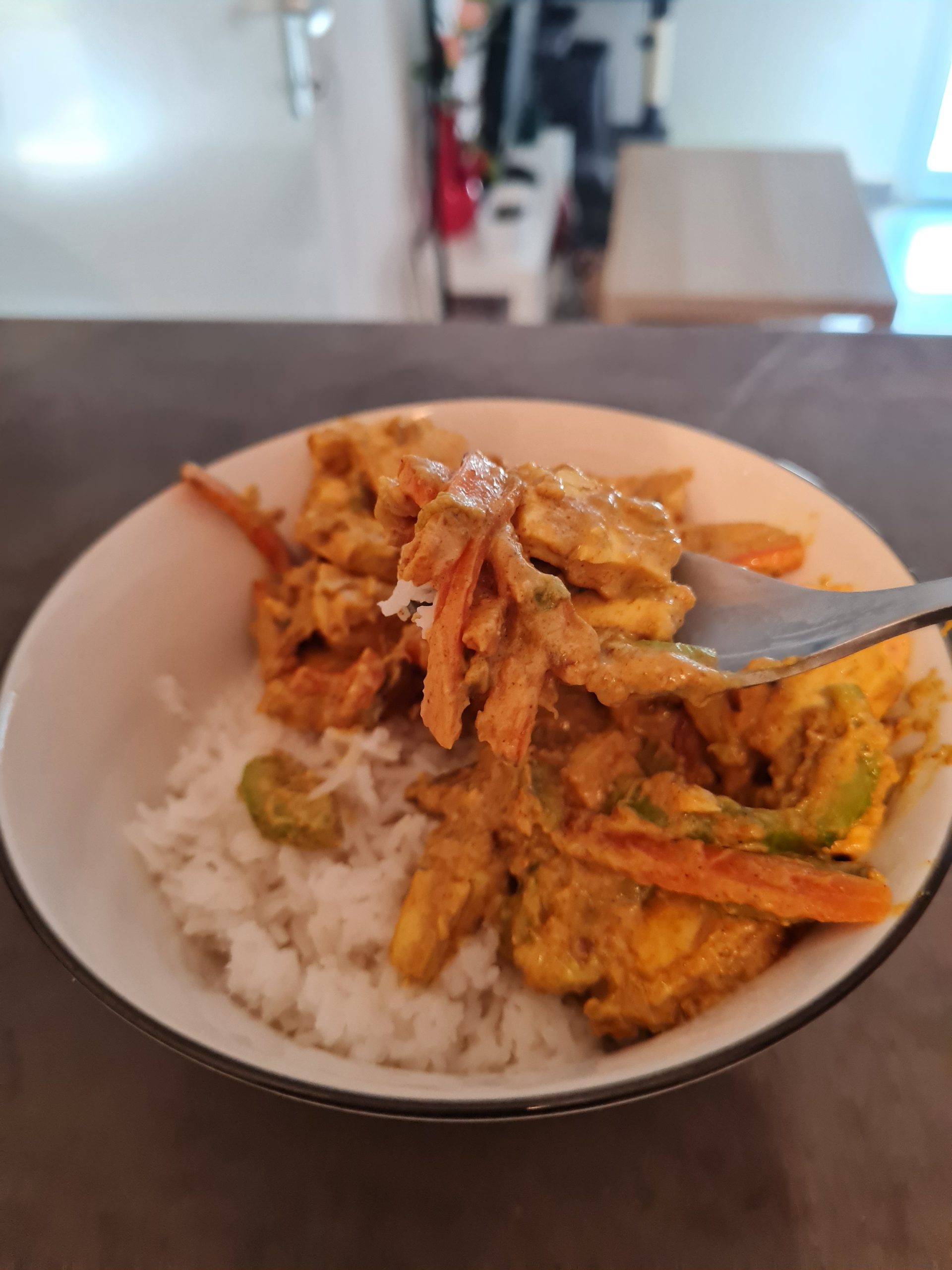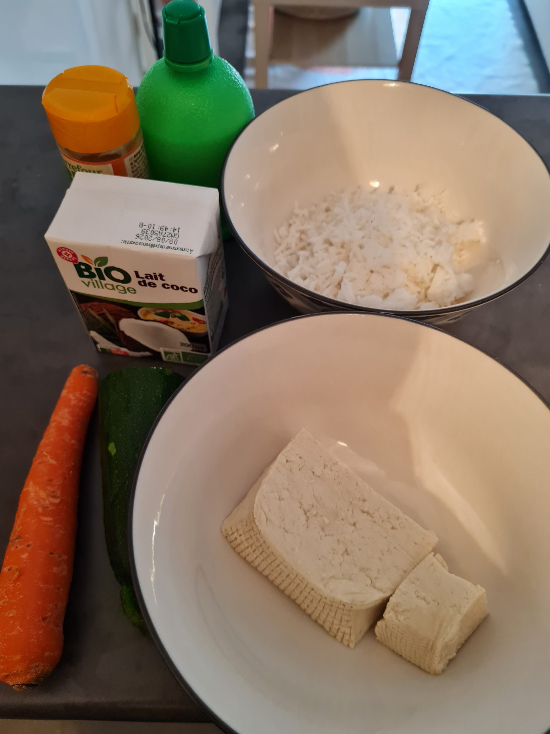 Faire revenir les légumes coupés en morceaux dans d'huile de coco. Puis ajouter le tofu, les épices et le lait de coco. Laissez mijoter 10 à 15 mins à feu doux.