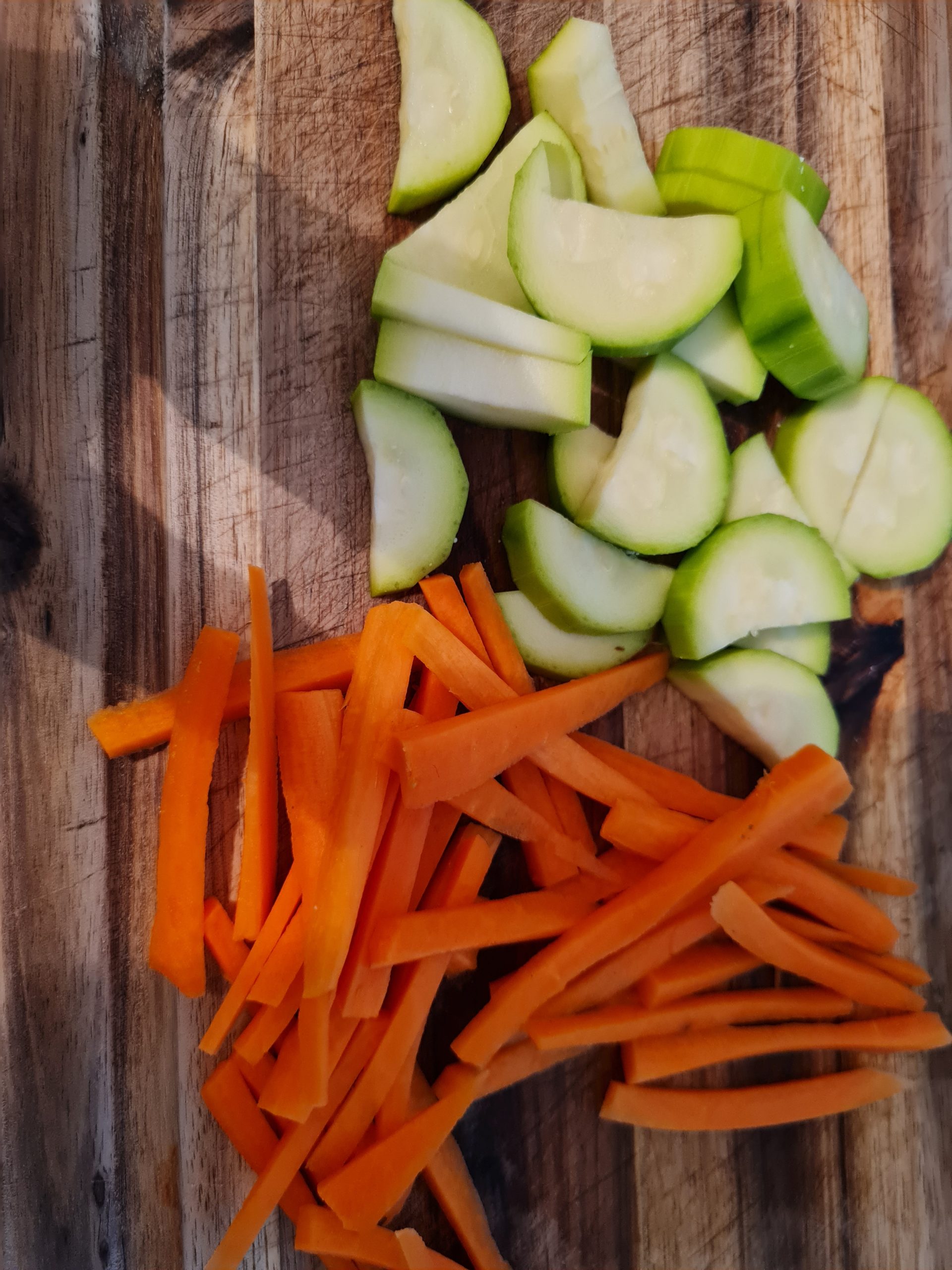 Tailler les carottes en julienne et les courgettes en demi lune.